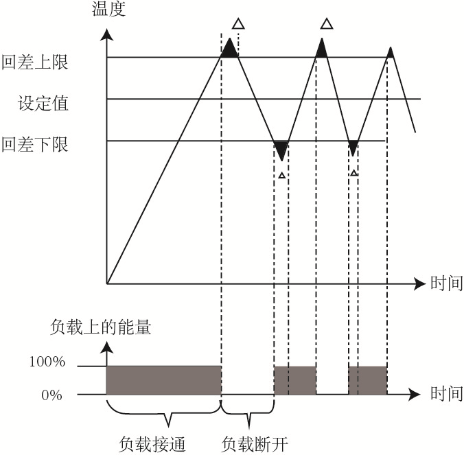 (一)二位式調(diào)節(jié)又稱通斷式控制,是將測量值與設(shè)定值相比較之差值經(jīng)放大處理后,對調(diào)節(jié)對象作開或關(guān)控制的調(diào)節(jié)。當(dāng)測量值低于設(shè)定值時(shí),儀表輸出“通”的信號(hào),負(fù)載因獲得全部能源而升溫;當(dāng)測量值高于設(shè)定值時(shí),儀表輸出“斷”的信號(hào),負(fù)載因失去全部能源而降溫;須指出由傳感器-儀表-執(zhí)行器(閥門或接觸器)-負(fù)載(電爐)-傳感器各部分組成的閉環(huán)系統(tǒng)在信號(hào)的傳遞、處理和調(diào)節(jié)中都不可避免地存在滯后,故儀表作出調(diào)節(jié)輸出后,需要一定的時(shí)間才能把調(diào)節(jié)結(jié)果再通過傳感器反饋至儀表,在此段滯后時(shí)間內(nèi),調(diào)節(jié)對象的溫度仍呈慣性上升或慣性下降,儀表此時(shí)處于“失控”階段。能源全部接通和全部關(guān)斷二種狀態(tài)的交替出現(xiàn),必然使被控參數(shù)有周期性的起伏,形成在設(shè)定值上下的震蕩,震蕩的幅度由儀表的回差(又稱開關(guān)差)和感溫元件的響應(yīng)時(shí)間、加熱器的熱阻等系統(tǒng)其他部分的特性所決定。這在二位式調(diào)節(jié)中無法避免。但在空調(diào)、農(nóng)業(yè)培植等允許溫度有一定范圍波動(dòng)的場合,可避免執(zhí)行器的頻繁動(dòng)作,反有利于系統(tǒng)的運(yùn)行。