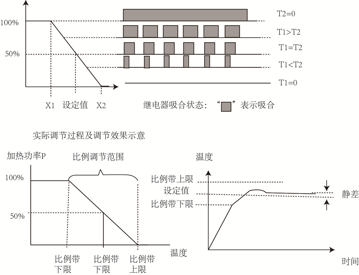比例調(diào)節(jié)的靜差:比例或時(shí)間比例調(diào)節(jié)在系統(tǒng)穩(wěn)定時(shí),其實(shí)際溫度值與設(shè)置溫度值之間有時(shí)會(huì)有一個(gè)偏差,即調(diào)節(jié)的結(jié)果值與設(shè)置的目標(biāo)值之間有一差值,專業(yè)上稱之為“靜差”,靜差一般為數(shù)攝氏度,可正可負(fù)。靜差的大小和方向取決于全輸出時(shí)加熱功率的高低、環(huán)境溫度或電網(wǎng)電壓的改變和比例帶的大小等各種原因。
