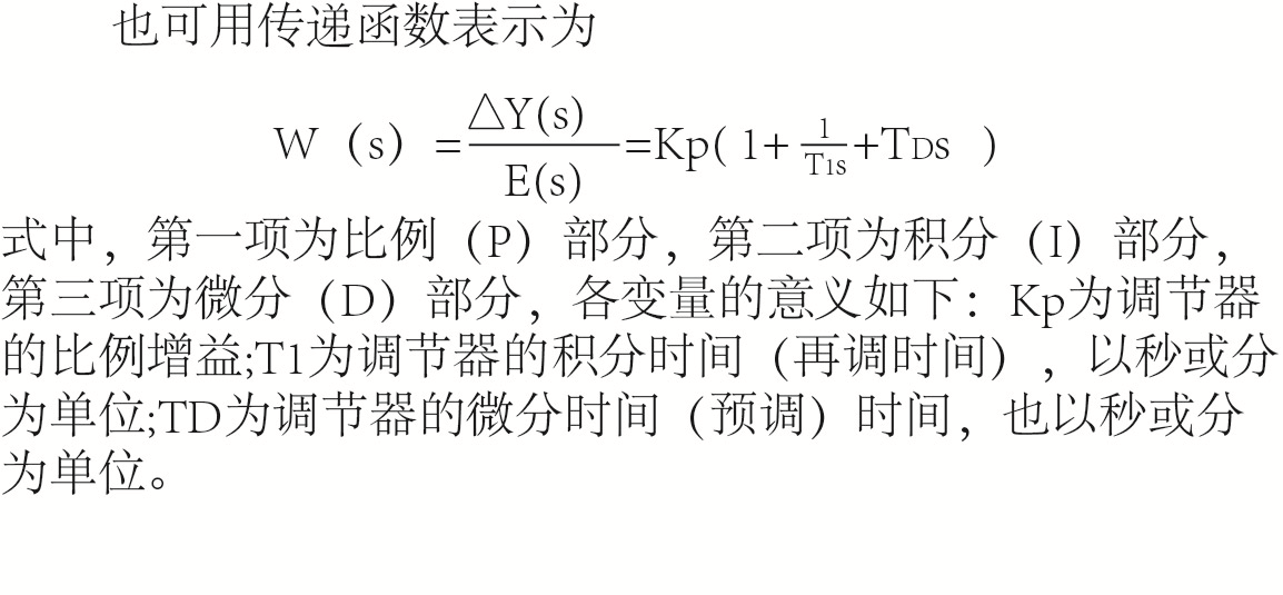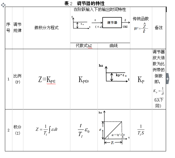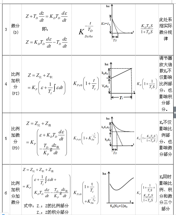 調(diào)節(jié)器的調(diào)節(jié)規(guī)律或稱調(diào)節(jié)器的特性。第一種稱為比例調(diào)節(jié)規(guī)律,第二種稱為積分調(diào)節(jié)規(guī)律,第三種稱為微分調(diào)節(jié)規(guī)律。此外就是比例加積分,比例加微分以及比例加積分加微分調(diào)節(jié)規(guī)律。這些調(diào)節(jié)規(guī)律的微積分方程式、在階躍(即訊號(hào)一下子)輸入下的輸出時(shí)間特性以及傳遞函數(shù)等。