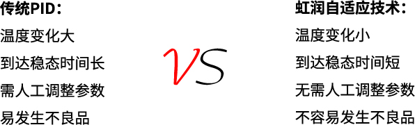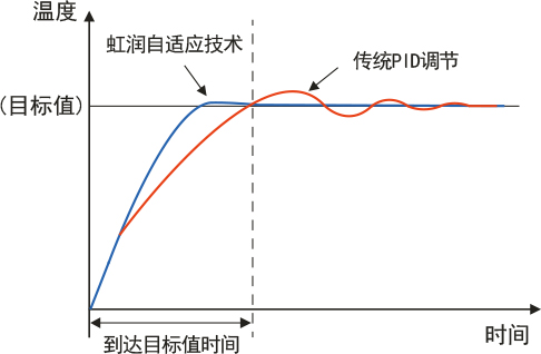 虹潤自適應(yīng)控制技術(shù)可自動整定出較佳PID值。監(jiān)視裝備的溫度控制狀態(tài),自動調(diào)節(jié)PID值,對工件變化及裝備變化、環(huán)境變化等進(jìn)行較佳溫度控制。