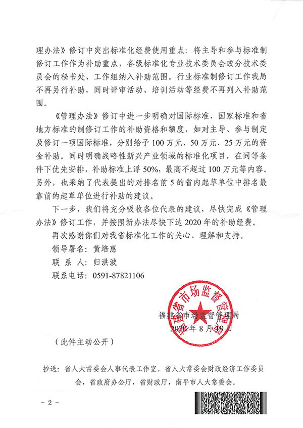 2020年8月19日,福建省市場(chǎng)監(jiān)督局就我的建議作出閩市監(jiān)函[2020]247號(hào)答復(fù),答復(fù)中表示,省政府已批準(zhǔn)新增加1080萬元資金用于我省標(biāo)準(zhǔn)化專項(xiàng)資金補(bǔ)助。至此標(biāo)準(zhǔn)化專項(xiàng)資金問題得以解決。