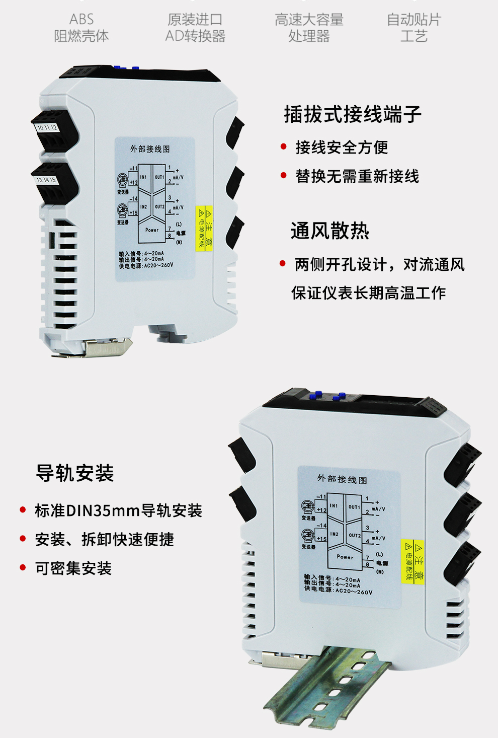OHR-X33系列導(dǎo)軌式智能配電器給二、三線(xiàn)制變送器提供隔離的電源電壓,將變送器產(chǎn)生的直流電壓電流信號(hào),經(jīng)本隔離器轉(zhuǎn)換成所需的輸出信號(hào)至控制系統(tǒng)。寬電源設(shè)計(jì):20-260V交直流供電。配置高清顯示單元,通過(guò)輕觸按鍵設(shè)置每個(gè)通道的參數(shù)及每個(gè)通道之間的切換。