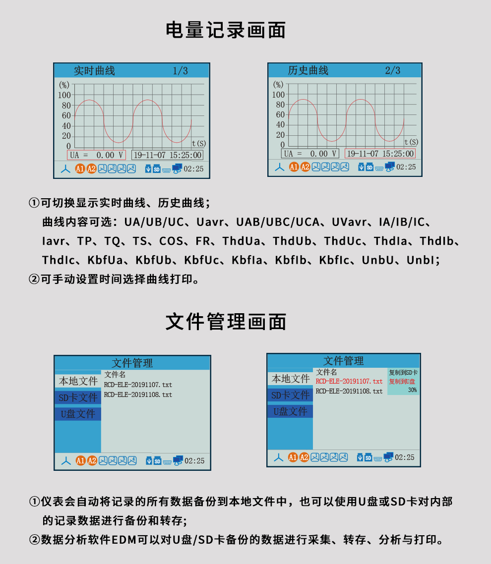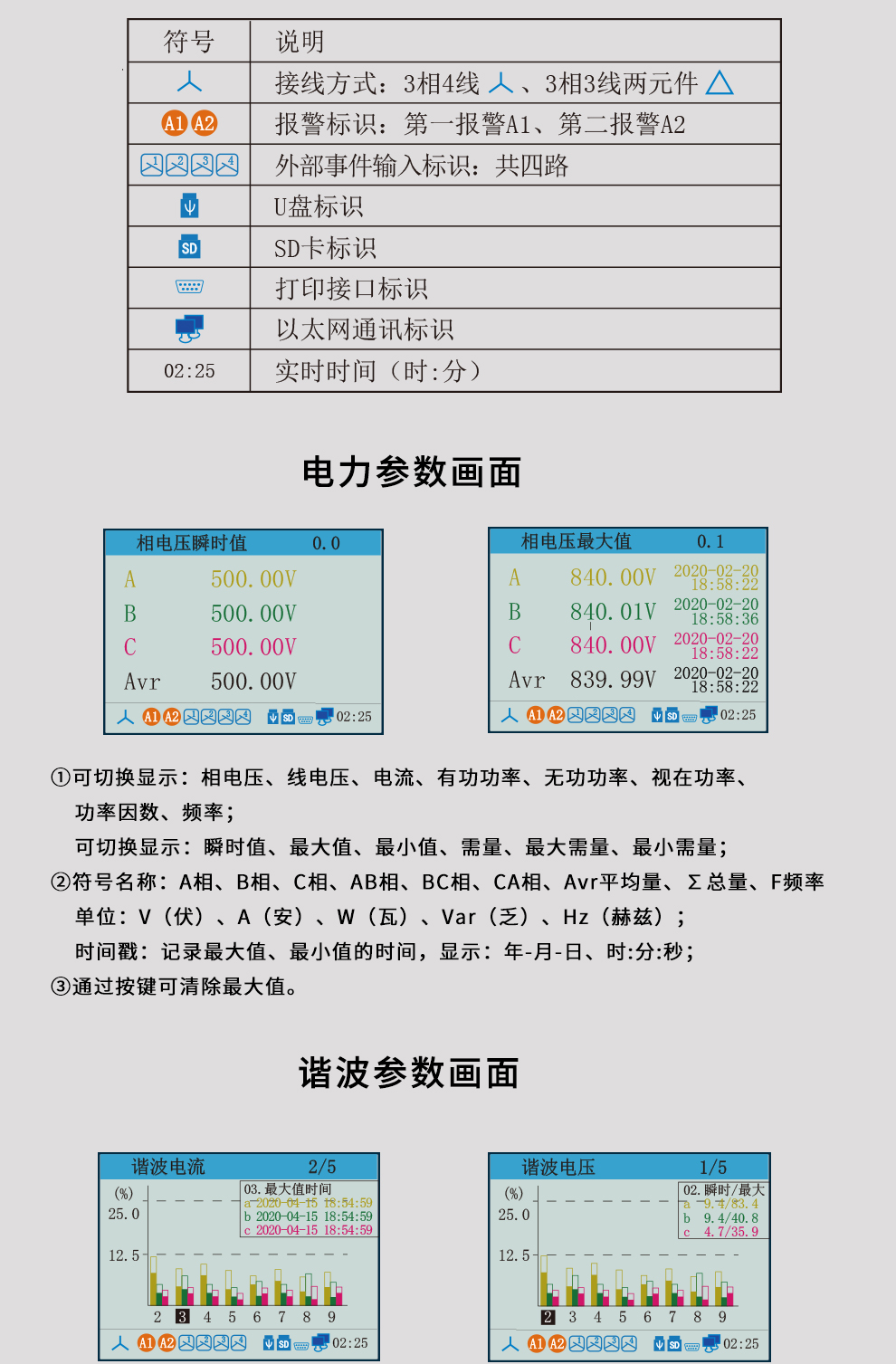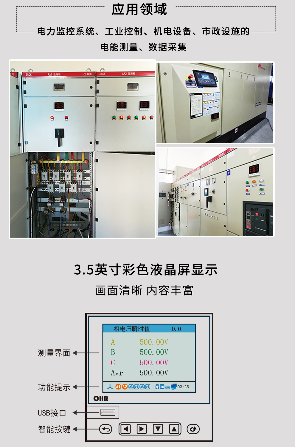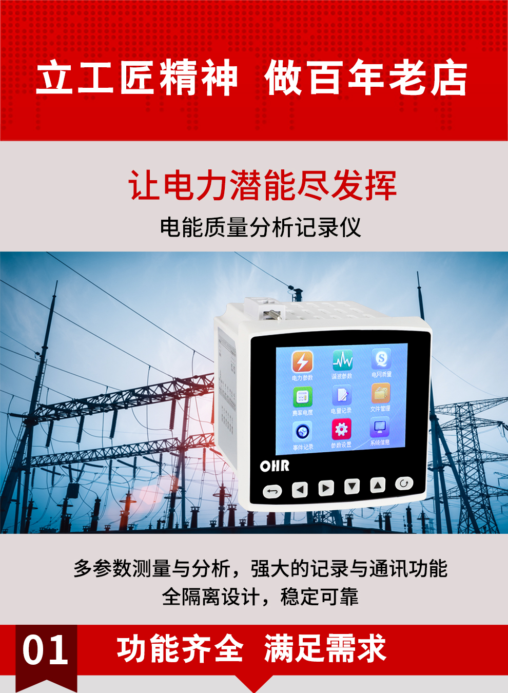 OHR-C900系列電能質(zhì)量分析記錄儀采用新進的集成電路及數(shù)字采樣技術(shù),對三相電氣線路中的交流電流/電壓、 有功功率、無功功率、視在功率、功率因數(shù)、工頻周波、諧波、有功電能、無功電能、四象限電能、波峰系數(shù) 及不平衡度等進行實時測量顯示與在線分析。