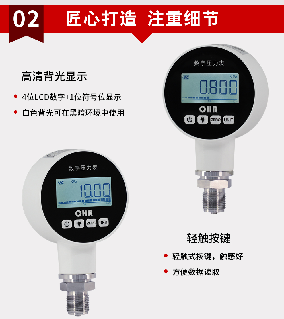 OHR-DP10系列智能數(shù)字壓力表內(nèi)置高精度傳感器,能夠準(zhǔn)確的實(shí)時(shí)顯示壓力,并具有精度高、長期穩(wěn)定性好的 特點(diǎn)。該產(chǎn)品采用鋁合金殼體和不銹鋼接頭,抗震性好,能夠測(cè)量氣體、液體、油等介質(zhì);具有一鍵清零、峰值 谷值記錄、量程百分比棒圖顯示、單位切換等功能;適用于便攜式壓力測(cè)量、設(shè)備配套、 校驗(yàn)設(shè)備等壓力測(cè)量領(lǐng)域。