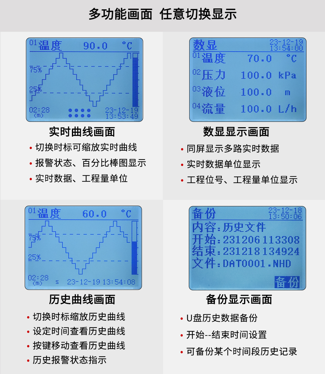 NHR-PR50系列數據記錄器顯示功能強大,具有實時曲線畫、數顯畫面、歷史追憶畫面、備份畫面。儀表采用主副機結構設計,主機可提供4路萬能信號輸入,通道間 相互隔離;4限報警輸出、4路變送輸出,RS485通訊、以太網通訊等功能,連接副機可將I/O容量 擴展至8路。帶USB數據轉存功能,存儲時間最長可達5825天。