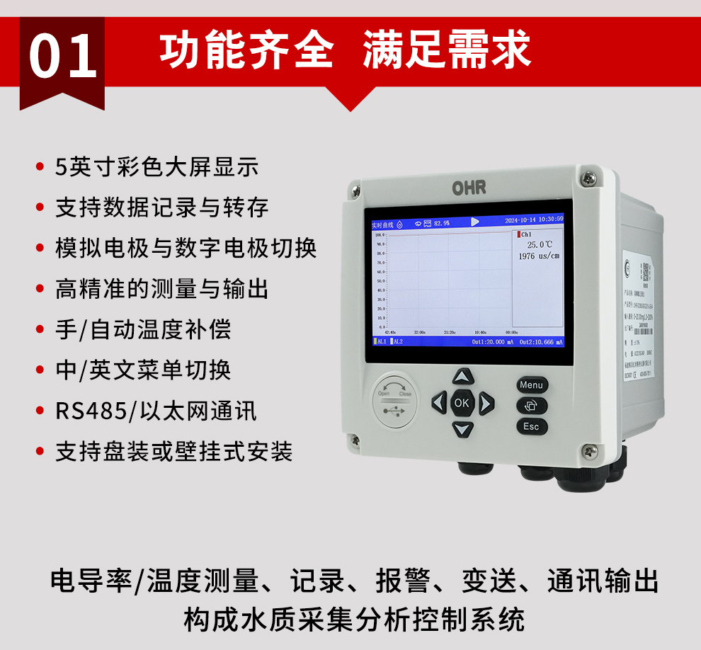 OHR-EC80系列電導(dǎo)率記錄儀是一款在線化學(xué)分析記錄控制器,可對工業(yè)用水的電導(dǎo)率 /TDS值進(jìn)行連續(xù)測量和控制。記錄儀具有兩路模擬信號(hào)輸出、兩路繼電器報(bào)警輸出以及 RS485/以太網(wǎng)通訊輸出等功能,方便用戶進(jìn)行數(shù)據(jù)傳輸和監(jiān)控。具有強(qiáng)大的顯示功能,使用戶能夠清晰地了解系統(tǒng)運(yùn)行情況。