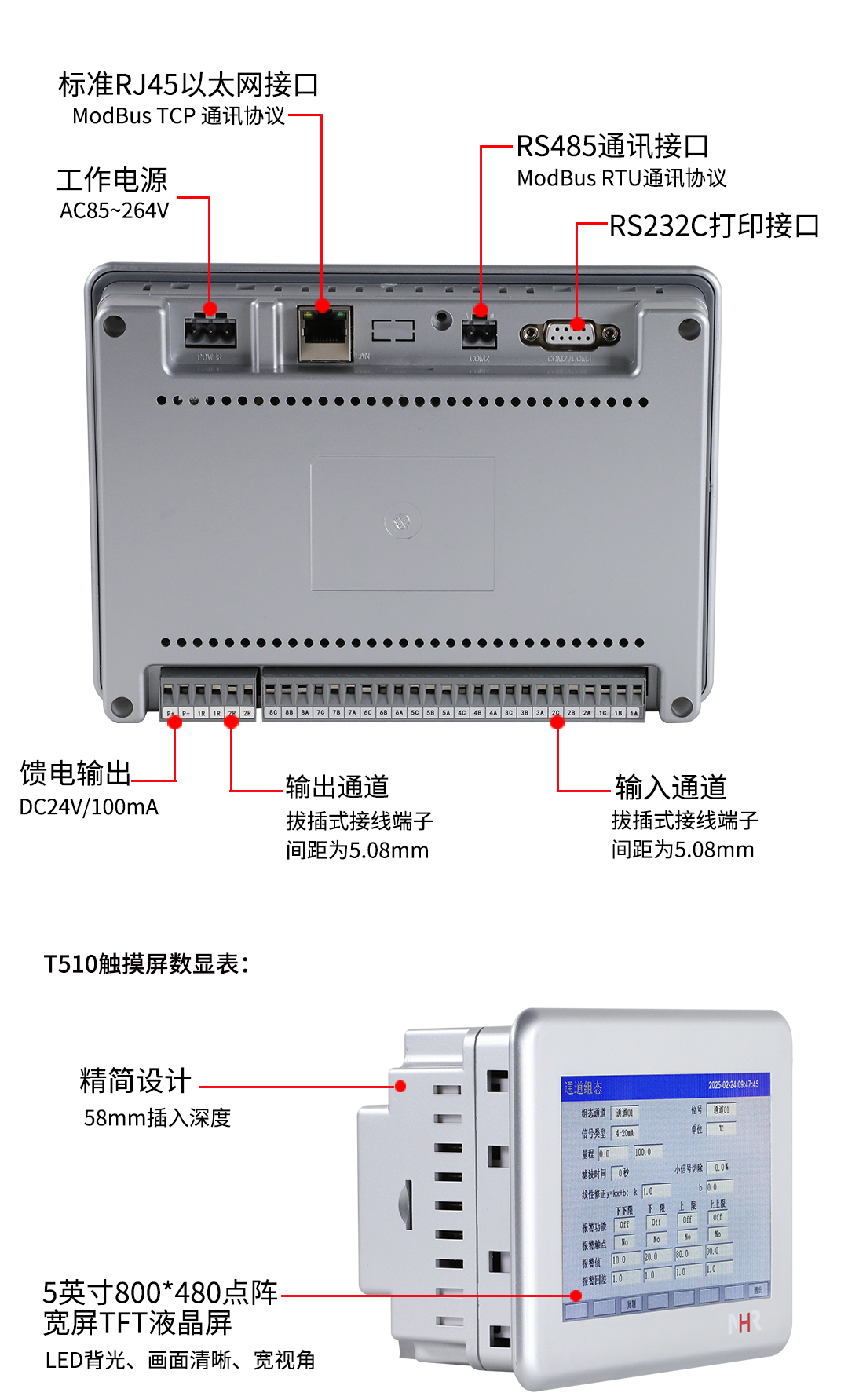 NHR系列觸摸屏數(shù)顯表采用新型大規(guī)模集成電路,對(duì)輸入、輸出、電源、信號(hào)采取可靠保護(hù)和強(qiáng)抗干擾設(shè)計(jì)。4路萬(wàn)能信號(hào)輸入(可組態(tài)選擇輸入:標(biāo)準(zhǔn)電壓、標(biāo)準(zhǔn)電流、熱電偶、熱電阻、毫伏等)??蓭?路報(bào)警輸出,1個(gè)饋電輸出,RS485通訊接口,以太網(wǎng)接口,微型打印機(jī)接口;具有強(qiáng)大的顯示功能,實(shí)時(shí)測(cè)量顯示,棒圖顯示,報(bào)警狀態(tài)顯示,組態(tài)畫(huà)面顯示等。