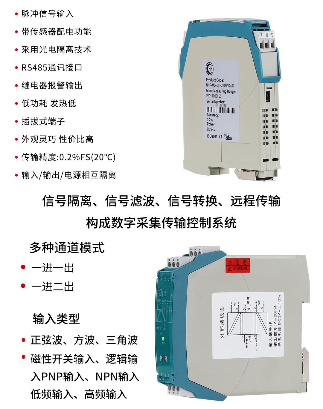 NHR-M34系列智能頻率轉(zhuǎn)換器將頻率信號(hào)經(jīng)隔離整形放大后,變送隔離輸出所需的信號(hào),也可向現(xiàn)場的一次儀表提供電源回路。