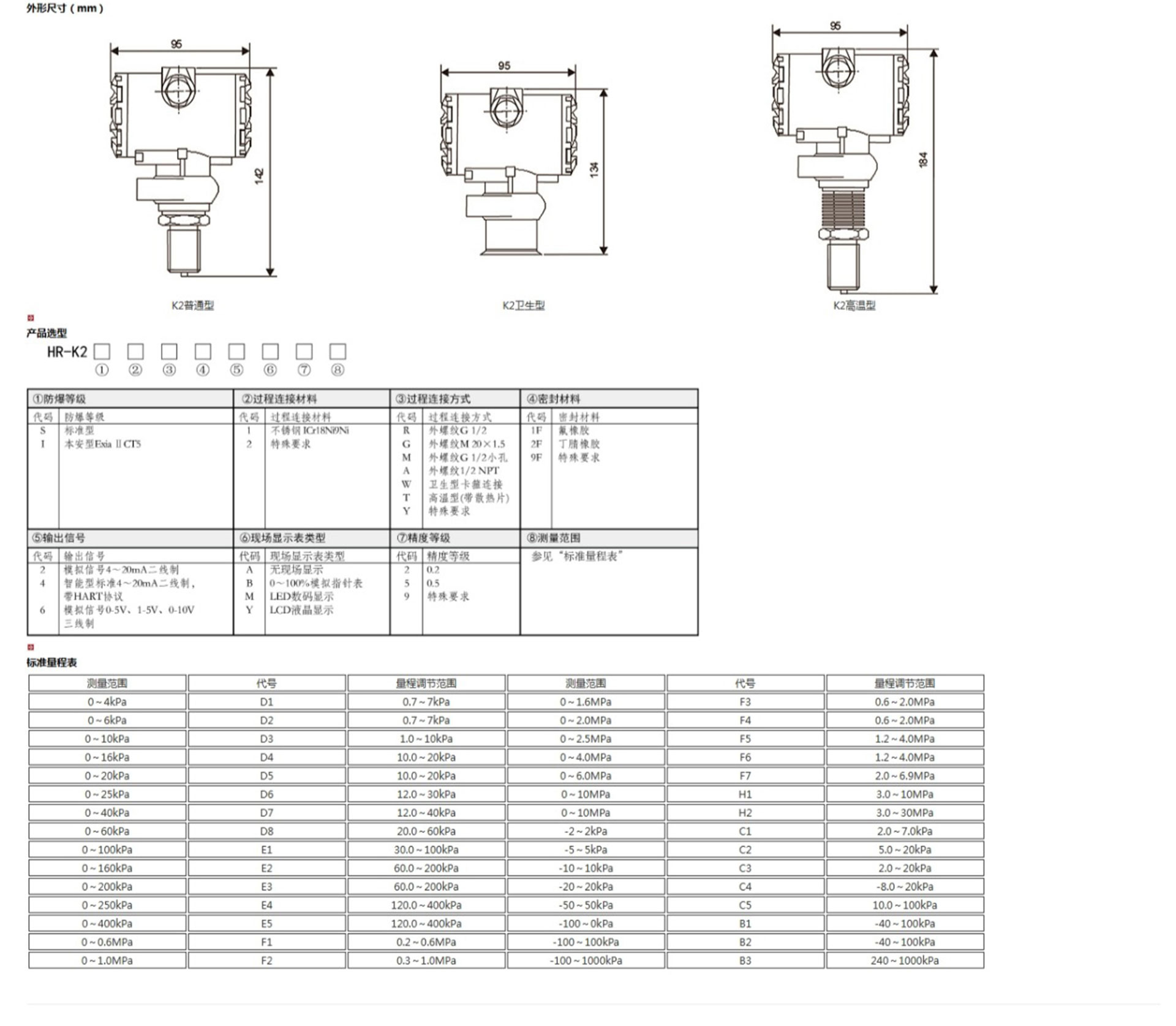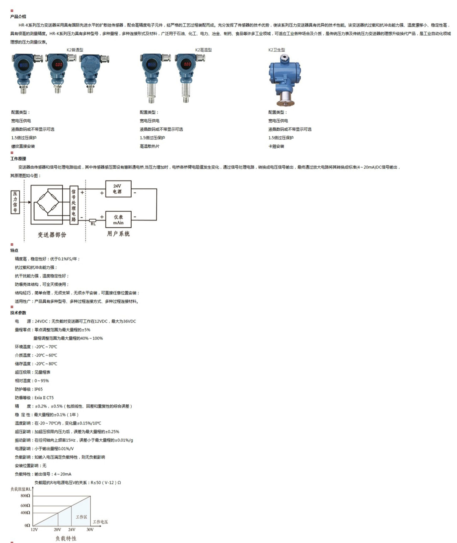 HR-K系列壓力變送器采用具有國際先進水平的擴散硅傳感器,配合高精度電子元件,經(jīng)嚴(yán)格的工藝過程裝配而成。充分發(fā)揮了傳感器的技術(shù)優(yōu)勢,使該系列壓力變送器具有優(yōu)異的技術(shù)性能。該變送器抗過載和抗沖擊能力強、溫度漂移小、穩(wěn)定性高,具有很高的測量精度。