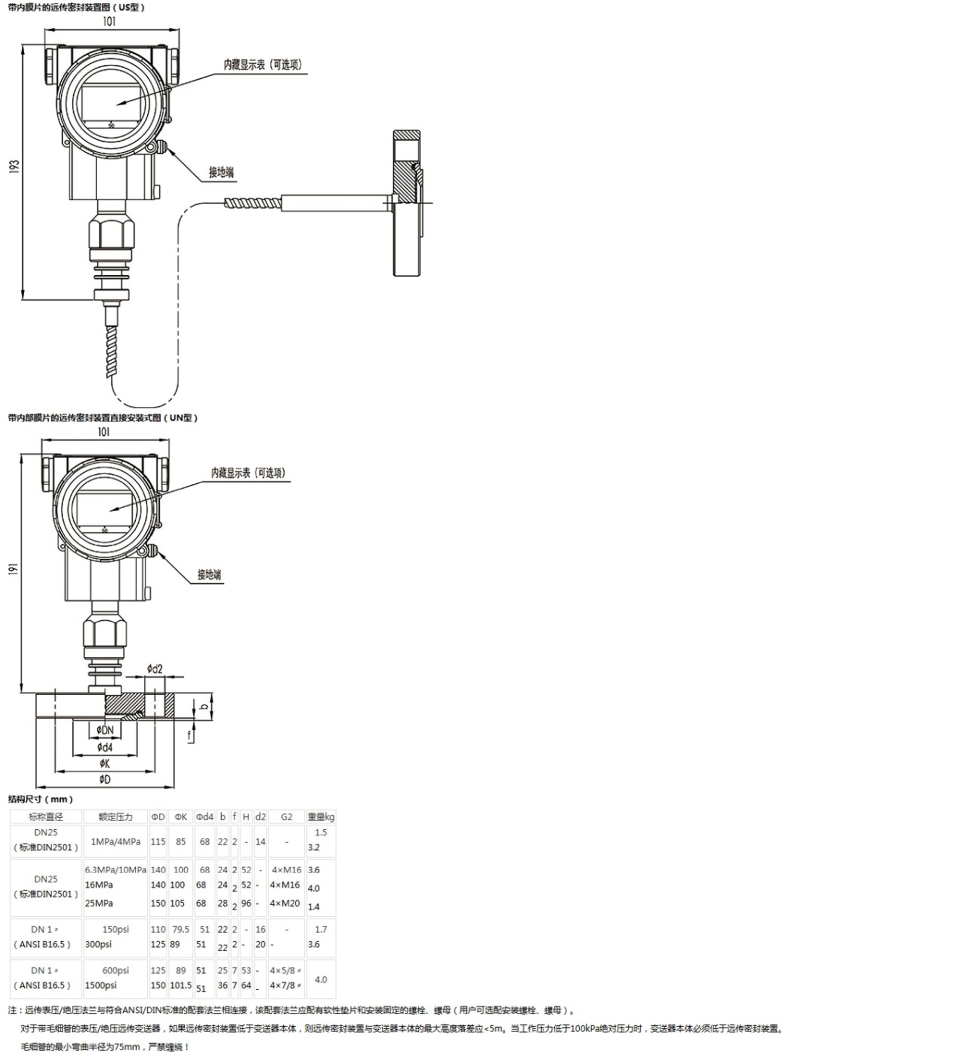 該產(chǎn)品用于測量液體、氣體或蒸汽的液位、密度、壓力,將其轉(zhuǎn)變成4~20mA (HART)電流輸出信號(hào),可通過RST375手持終端對(duì)它們進(jìn)行參數(shù)設(shè)定、過程監(jiān)控等。測量范圍(未遷移時(shí))為0-6kPa~25MPa,液位法蘭的額定壓力分別為:1.6/4MPa、6.4MPa、10MPa、150psi、300psi或600psi。