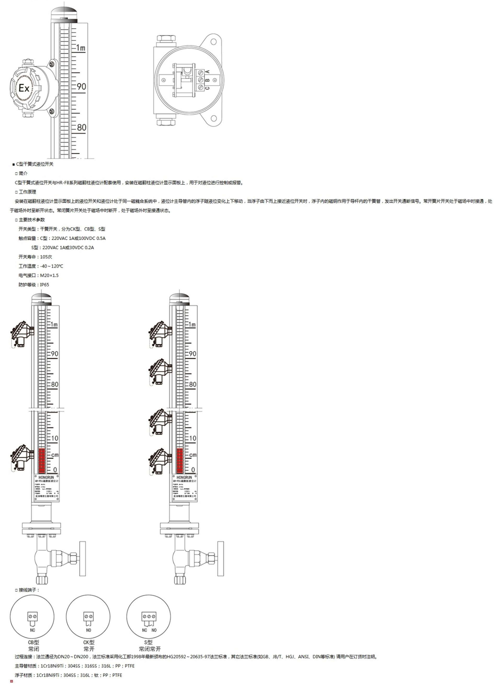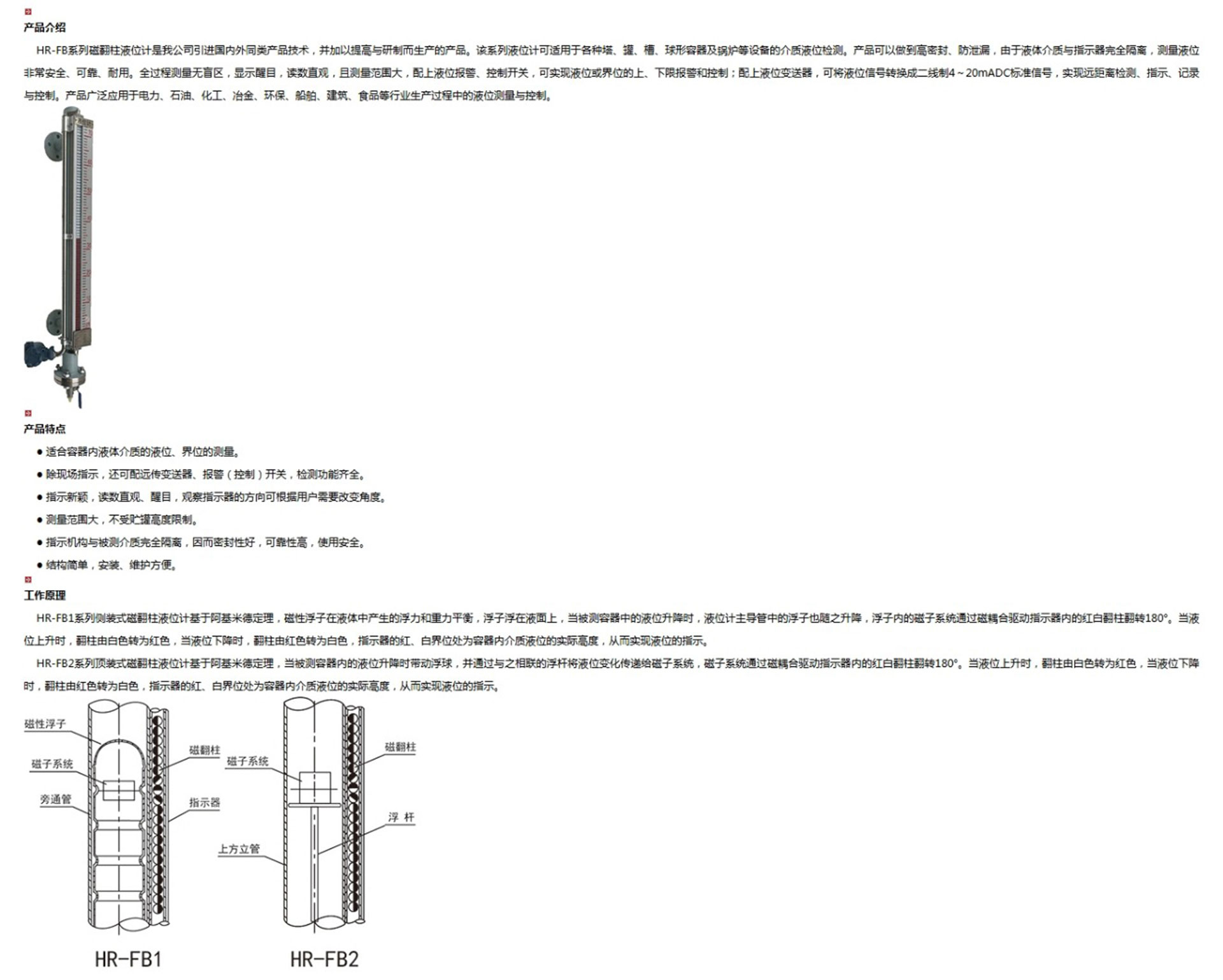 HR-FB系列磁翻柱液位計(jì)是我公司引進(jìn)國(guó)內(nèi)外同類(lèi)產(chǎn)品技術(shù),并加以提高與研制而生產(chǎn)的產(chǎn)品。該系列液位計(jì)可適用于各種塔、罐、槽、球形容器及鍋爐等設(shè)備的介質(zhì)液位檢測(cè)。產(chǎn)品可以做到高密封、防泄漏,由于液體介質(zhì)與指示器完全隔離,測(cè)量液位非常安全、可靠、耐用。
