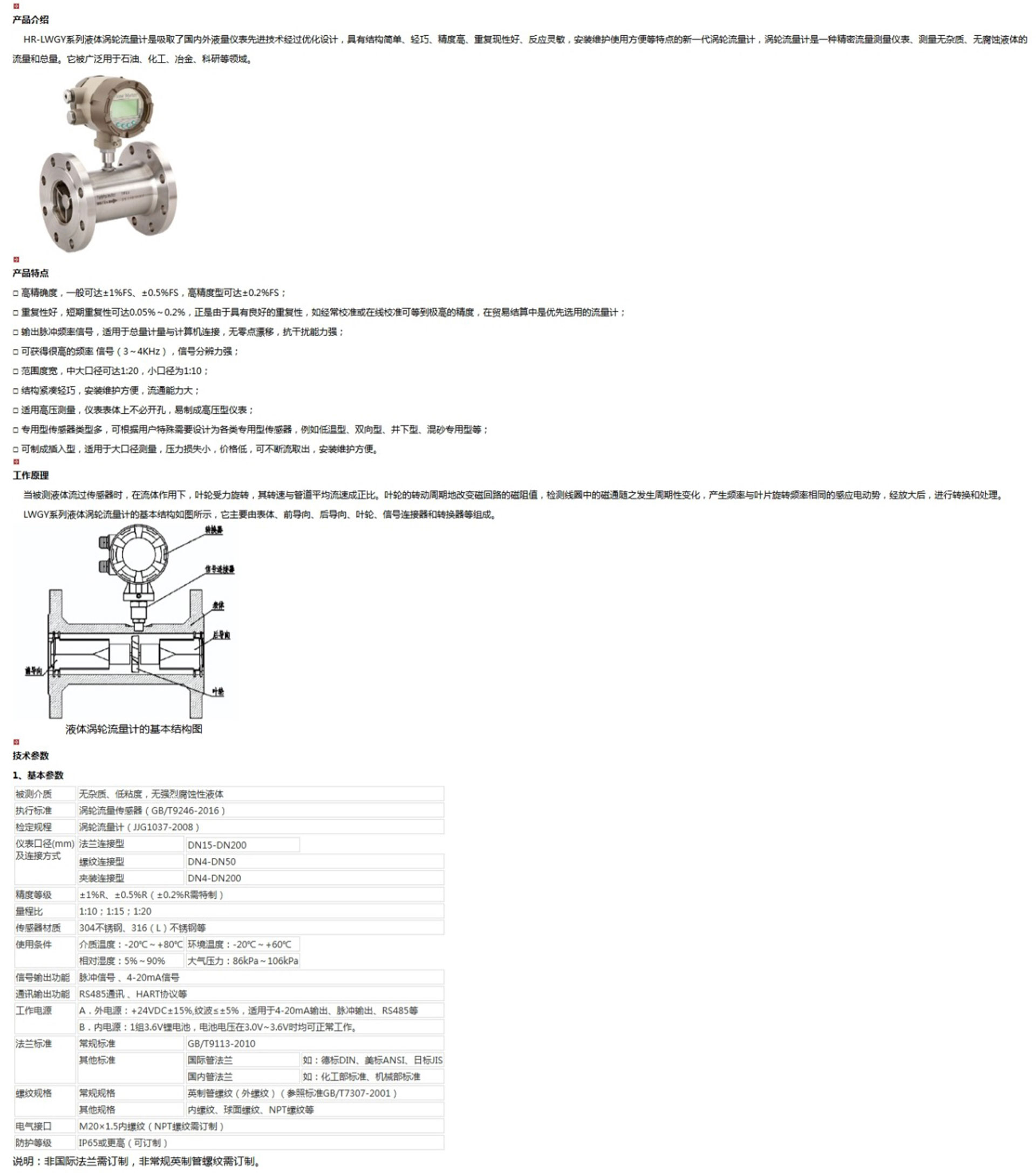 HR-LWGY系列液體渦輪流量計是吸取了國內(nèi)外液量儀表先進技術(shù)經(jīng)過優(yōu)化設(shè)計,具有結(jié)構(gòu)簡單、輕巧、精度高、重復現(xiàn)性好、反應(yīng)靈敏,安裝維護使用方便等特點的新一代渦輪流量計,渦輪流量計是一種精密流量測量儀表、測量無雜質(zhì)、無腐蝕液體的流量和總量。它被廣泛用于石油、化工、冶金、科研等領(lǐng)域。